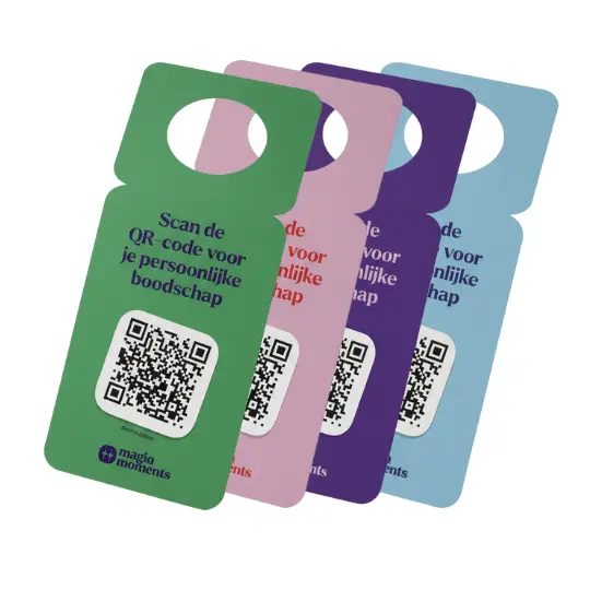 Je kunt als bedrijf kiezen voor een kaartje met 1 boodschap (dan hebben alle kaartjes dezelfde QR code) of je kunt de kaartjes krijgen met allemaal unieke QR codes. Zo kun je op elk kaartje een individuele boodschap zetten.